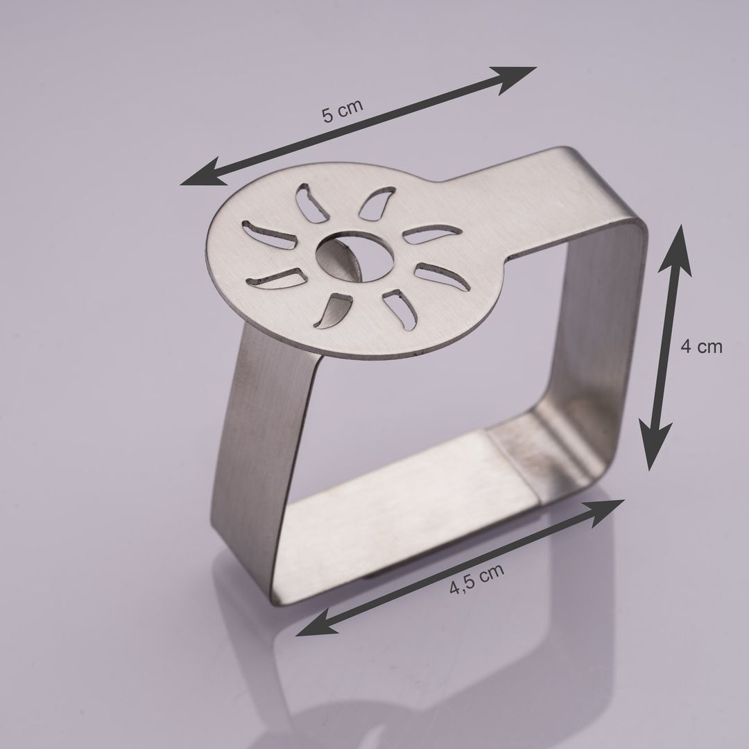 Edelstahl ist gegen Korrosion beständig, aber es kann und wird unter bestimmten Bedingungen rosten–wenn auch nicht so schnell oder stark wie herkömmliche Stähle. Rostfreie Stähle korrodieren, wenn sie über einen längeren Zeitraum schädliche Chemikalien, Salz, Fett, Feuchtigkeit oder Hitze ausgesetzt sind. Bitte reinigen Sie die Tischdeckenklammern umgehend und trocknen Sie sie mit einem weichen Tuch, wenn sie mit giftigen Flüssigkeiten ausgesetzt sind.